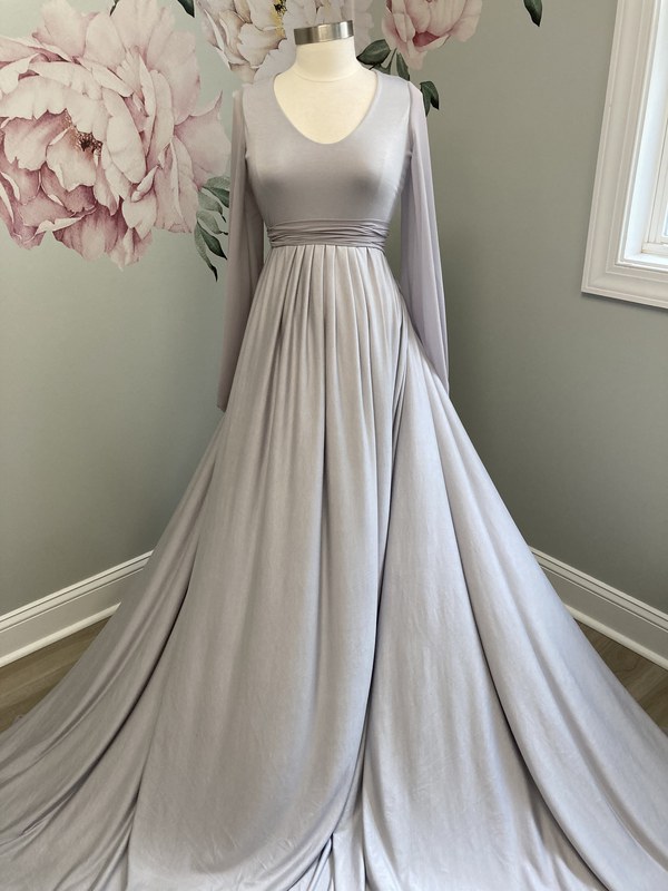You’ll also want to consider some of our other magnificent flying dresses, such as Edith. This stretchy jersey dress features a chiffon flying train that will make you stand out at any event. The train is also detachable to achieve a variety of looks at your pregnancy photoshoot.