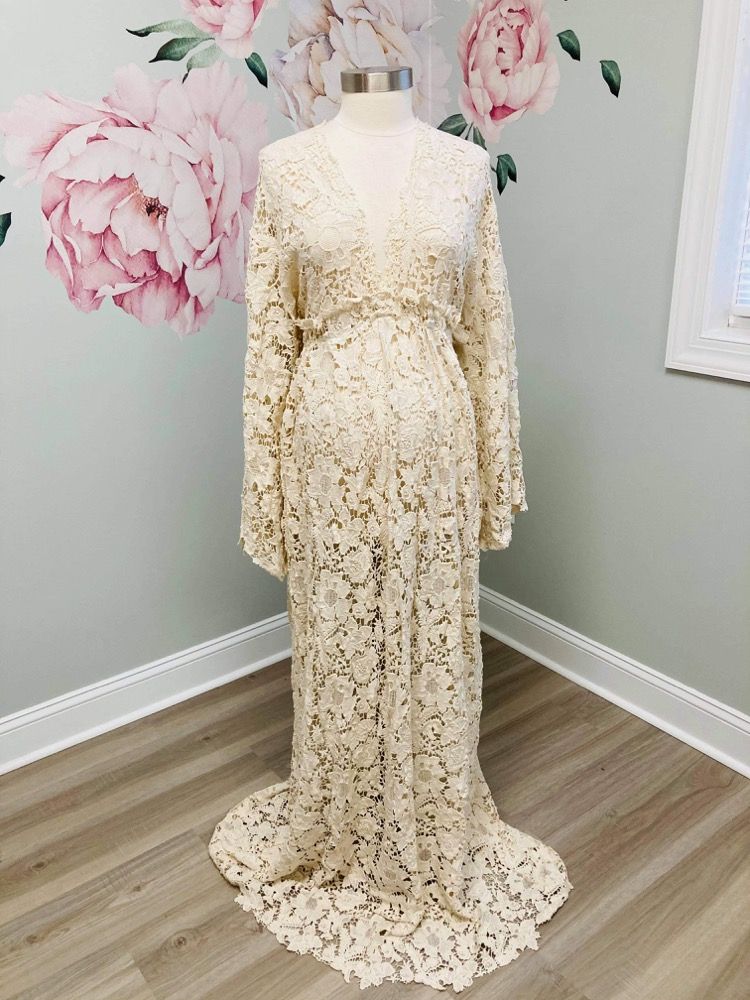 Delaney and Arwen, two other maternity dress rentals from J&L Designs, are also striking maternity photoshoot dress options. Both dresses feature vintage ivory lace that cascades comfortably over every bump for an elegant maternity look. Consider a boho designer dress for your upcoming fall event.