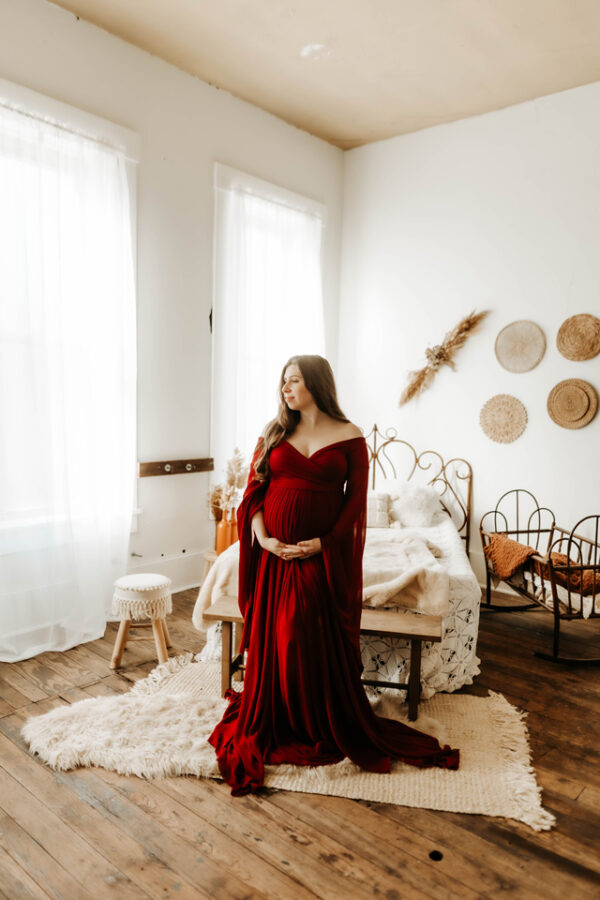 The Nora Gown is Soft and flowing. So very flattering and comfortable at the same time. Soft off the shoulder sleeves fixed to a crisscrossing sweetheart neckline create soft and demur lines. Flowy overlapping chiffon skirt has a side split. An option to pop your knee or stay covered.