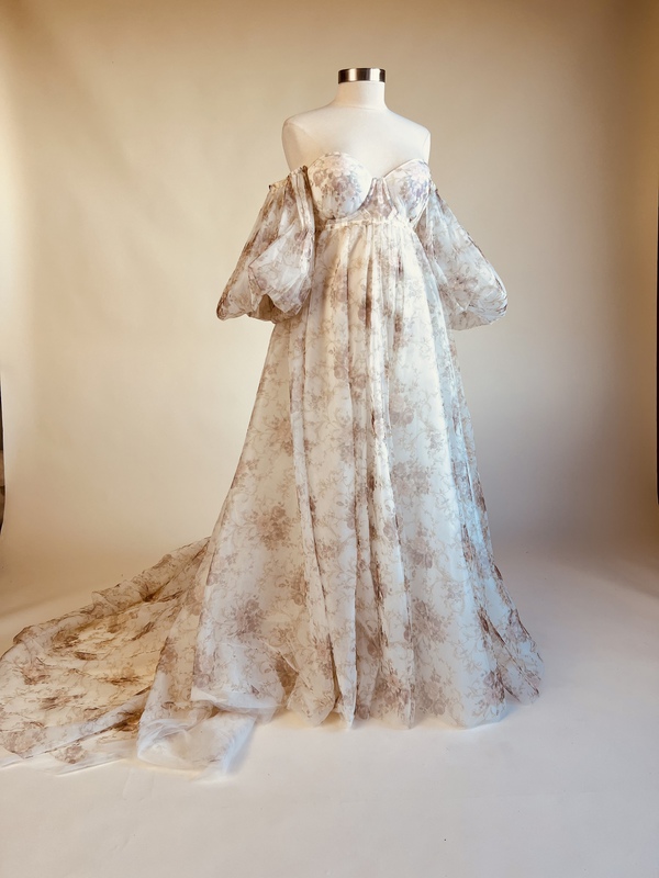 Bloom Beige is a gorgeous split front floral gown! Removable sleeves with corset tie. Perfect for any Maternity Photoshoot!