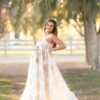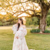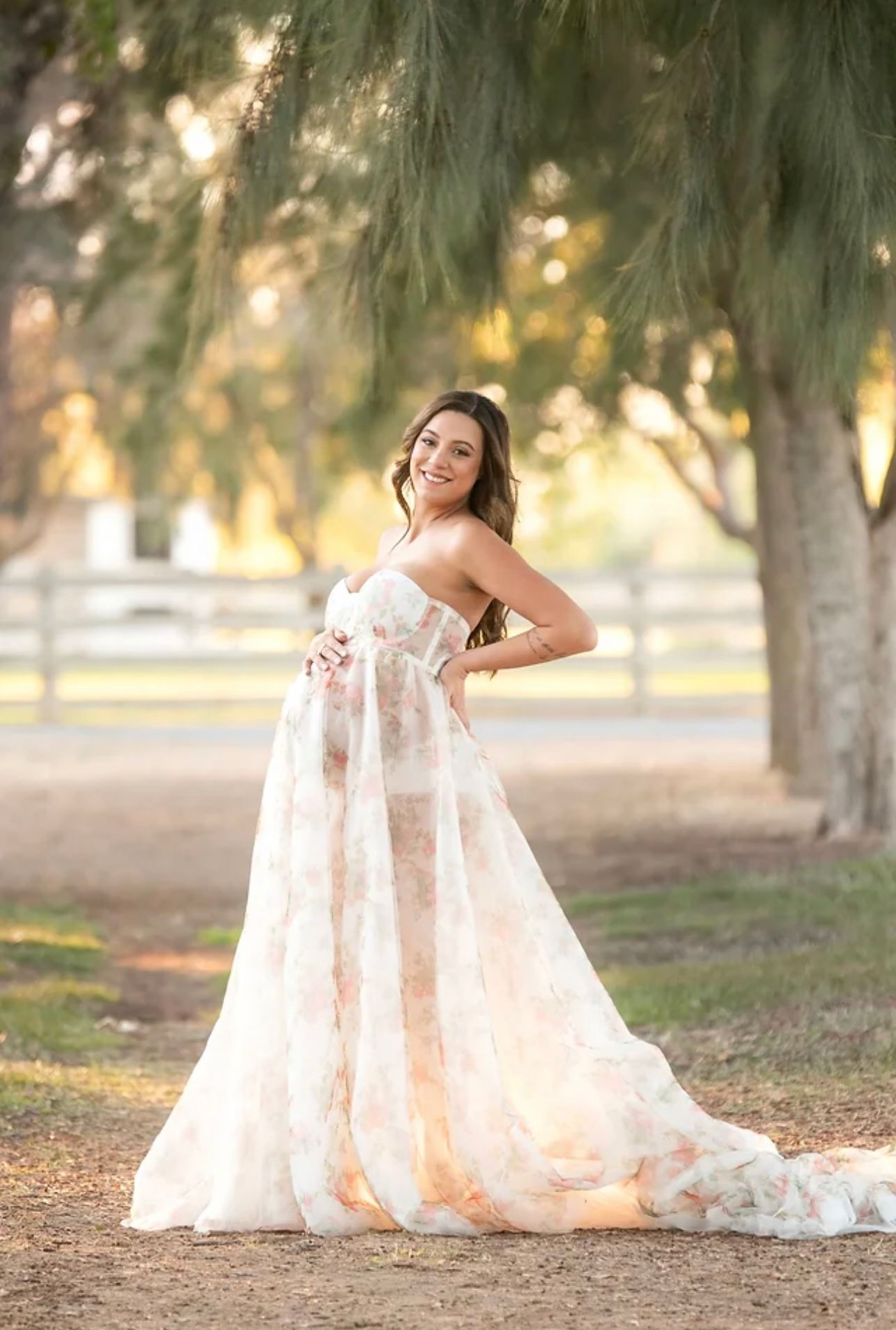 Butterfly Bloom is a gorgeous split front floral gown! Removable sleeves with corset tie. Perfect for any Maternity Photoshoot!