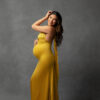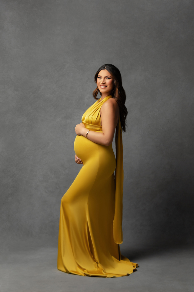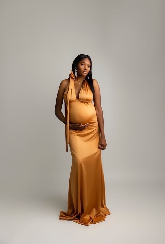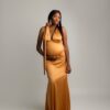 Show off that bump! Slinky satin creates sleek and sexy curves. A dress for the modern Mom looking to stand out from the rest. Create moments to remember and cherish. This floor length smooth and flattering stretch satin dress fits both maternity and non-maternity use. Use the infinity style top to create a look for your own.