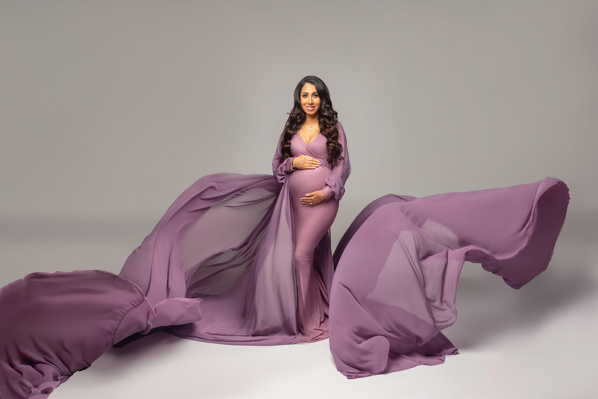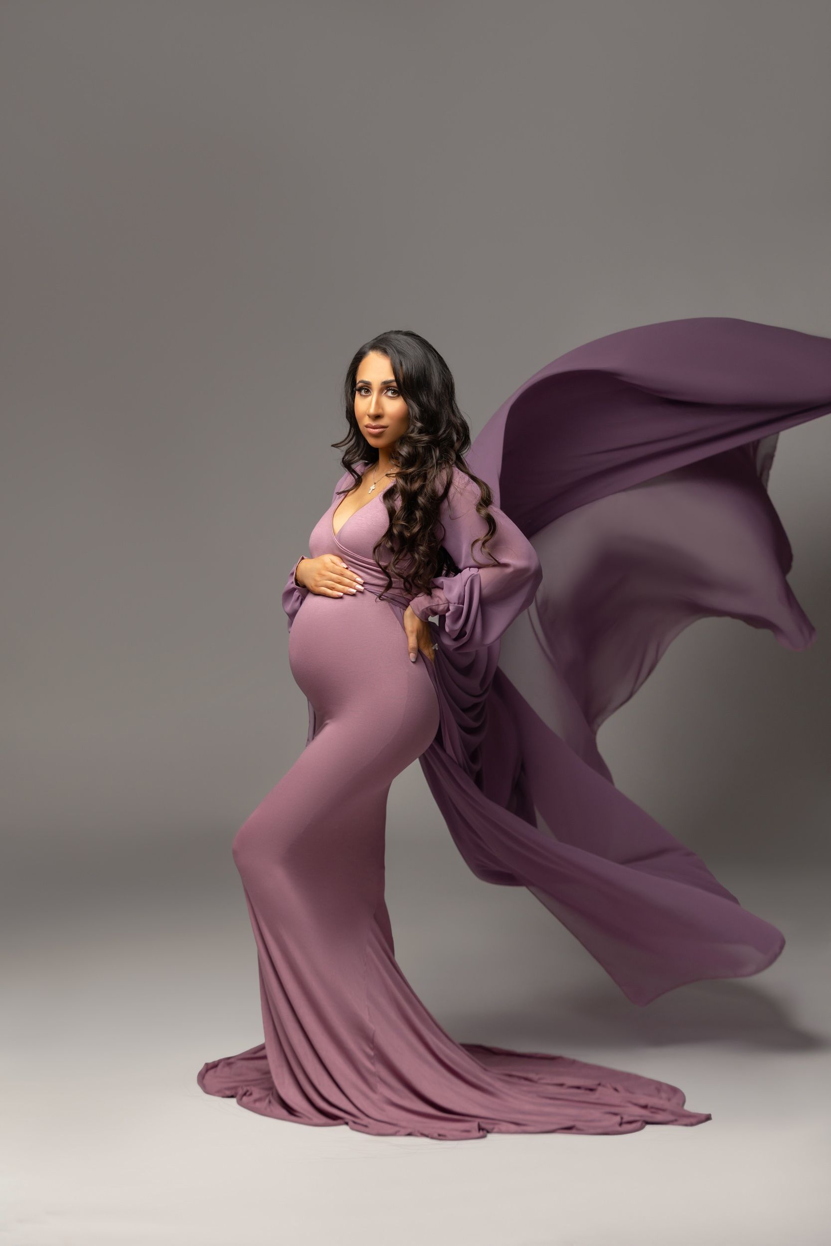Chiffon flying train and a smooth stretchy jersey dress come together to create the Edith 2-piece dress set. The flying chiffon tossing train adds drama to any photo session. Stand out from the rest and look amazing for your special event. Beautiful soft stretch rayon jersey knit with a detached chiffon train to create a classic gown that fits effortlessly to your fabulously curvy figure and delivers sensational swish as you pose for photos. Toss the chiffon train in the air tail or let it pool around you for a glamorous look Look your best with a form-fitting bodice and a v neckline and demure chiffon long sleeves tops a classical empire waistline. *Fabrics may not look like a perfect match in person, but you can see from our images that they look wonderful when paired together