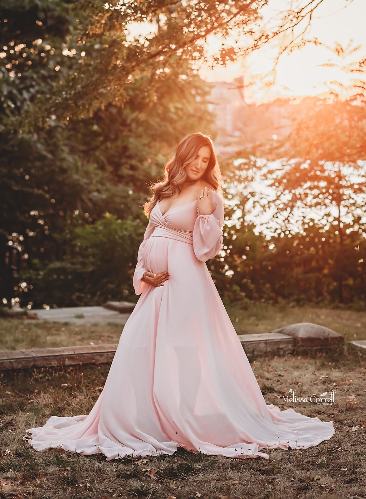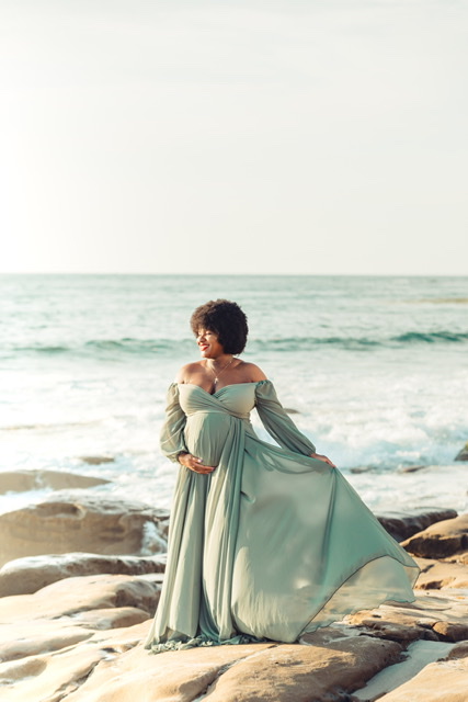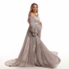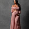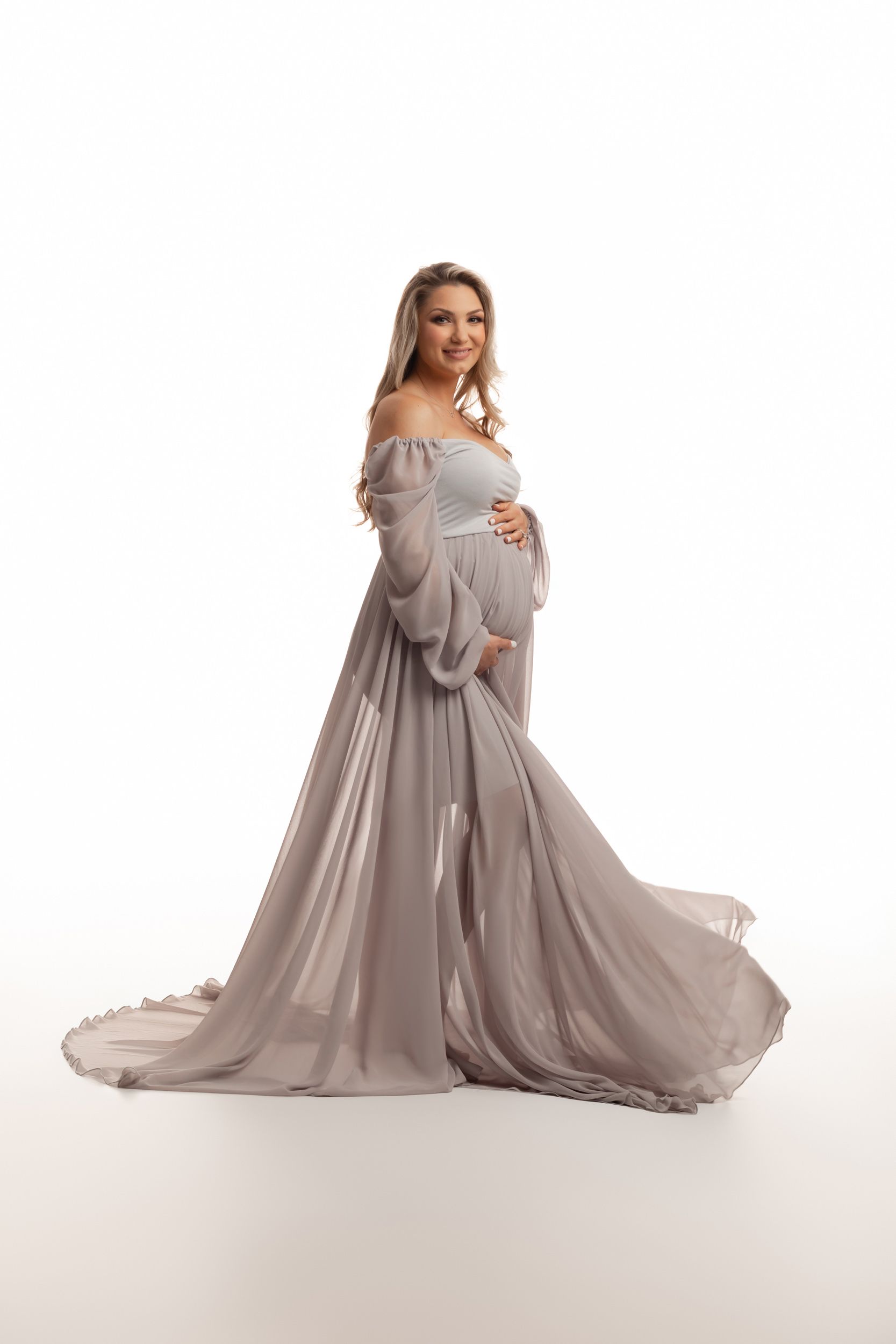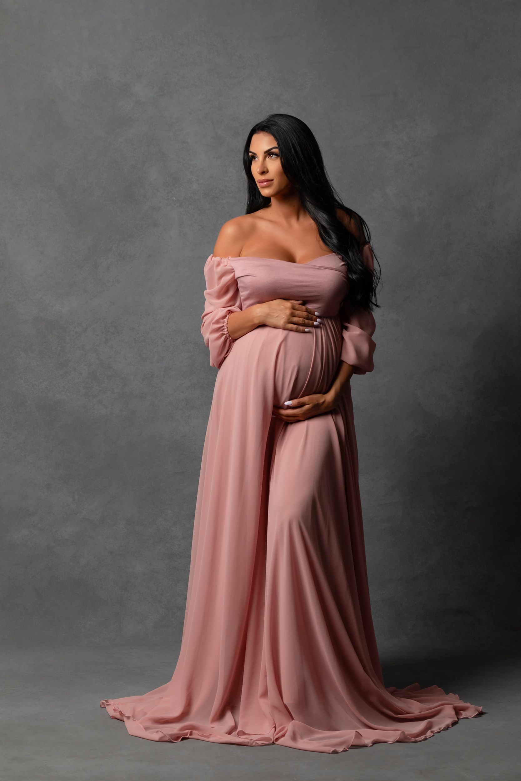 The Evie Gown is Soft and flowy. So very flattering and comfortable at the same time. Soft off the shoulder chiffon sleeves fixed to a crisscrossing sweetheart neckline create soft and demur lines. Flowy overlapping chiffon skirt has side split to show a little leg for images.