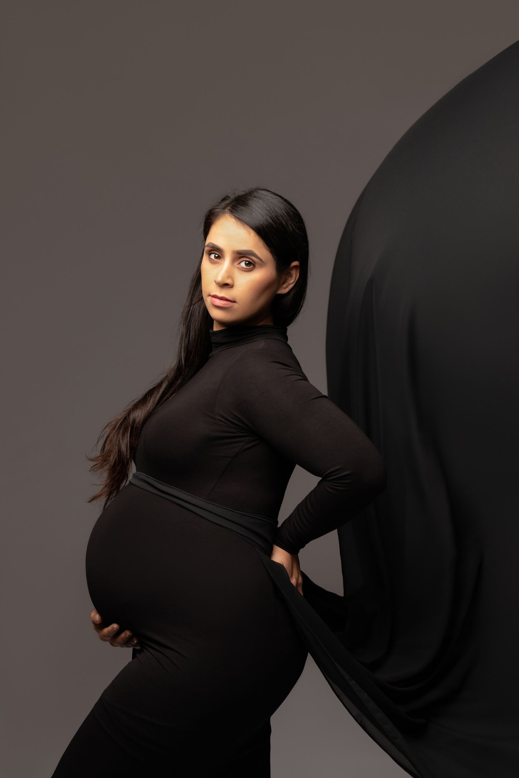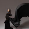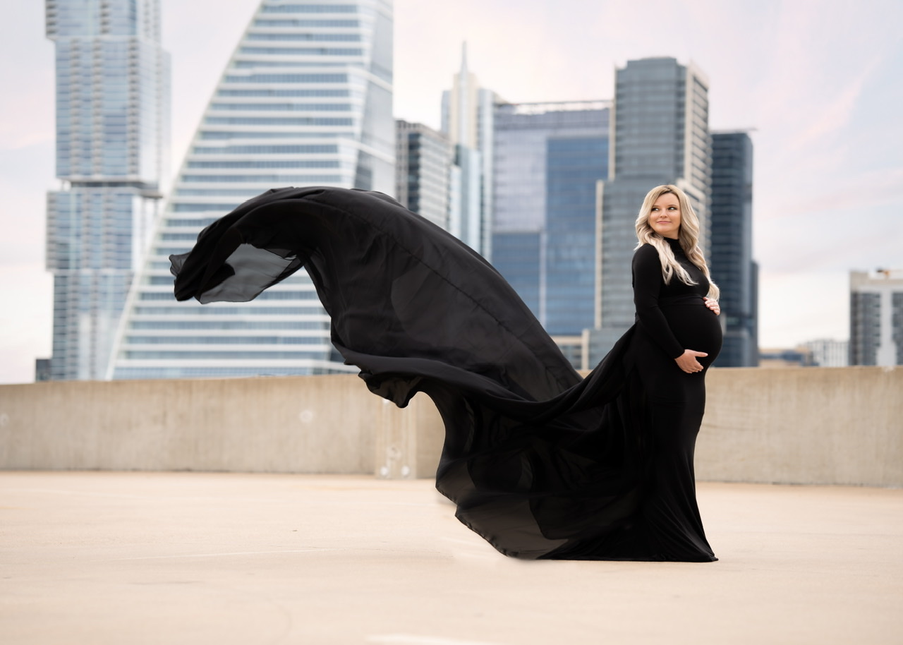 Sleek and Classic We’ve selected achingly beautiful jersey and chiffon for our Juliette maternity gown. A 2 piece set that is absolutely fabulous for maternity photography. Beautiful soft stretch rayon jersey knit with a detached chiffon train to create a classic gown that fits effortlessly to your fabulously curvy figure and delivers sensational figure as you pose for photos. Toss the train or let it pool around you for a glamorous look A form-fitting bodice with a wide mock neck and demure long sleeves tops a classical empire waistline. Light and airy detachable chiffon train ties around the fitted skirt cascades to floor length in fluid perpetual motion. Such flawless dress the perfect backdrop for a photo to keep forever.