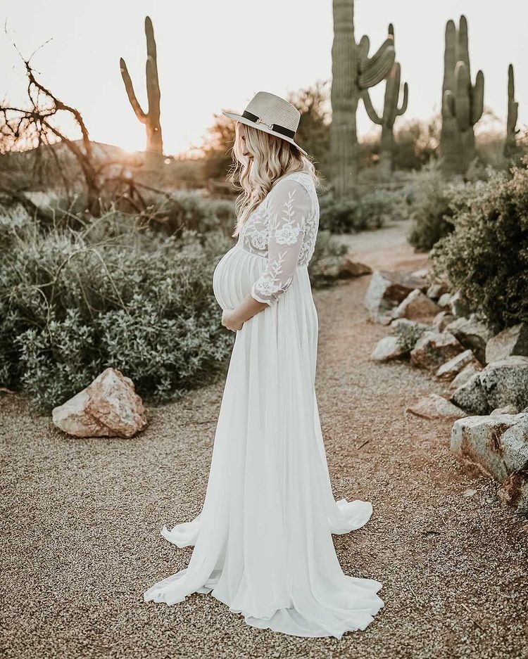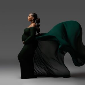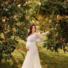 The Karina dress is made from a sheer unlined embroidered hand dyed in a lighter shade lace bodice with slight stretch and a chiffon skirt. The sleeves are 3/4 length with scallop edging. The chiffon skirt portion flares out into a full circle at the bottom and features a gathered front. The dress has a high scoop neckline and elastic under the bust to help accentuate the curves from belly to bust.