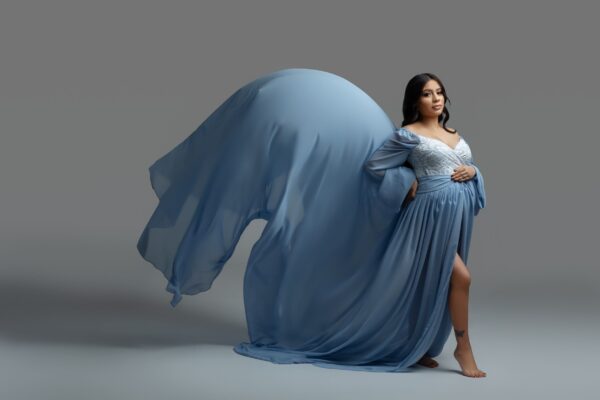 The Nicolette 2-piece set is perfect for your maternity photoshoot. Wear the Lace Bodysuit with or without the Kalani chiffon wrap skirt. Wrap the Kalani skirt around the lace bodysuit and leave a slit to the side to show a little leg. Or open the center front to show off the baby bump.