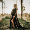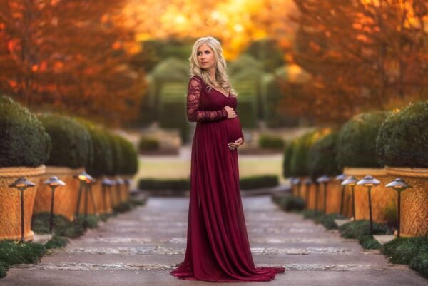 Float on air with this long chiffon and lace gown. The gown features a plunging neckline with lace sleeves ballerina shoulders that sit on the cusps of your shoulder for a demure look. There is a fitted slip under the chiffon so you can wear the gown for just about any event from maternity photography sessions to baby showers.
