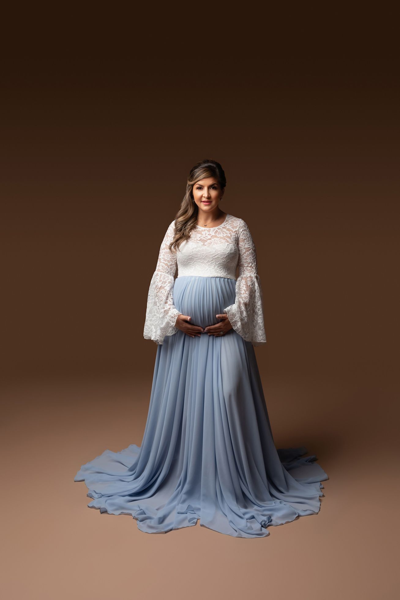 The Fully lined Tyra dress is made from a sheer lined embroidered lace bodice with a sweetheart design in the lining and lace that offers stretch. The bottom is made with a flowy lined chiffon skirt. The sleeves have a fun bell swing. The chiffon skirt portion flares out at the bottom and features a gathered front for added flare.