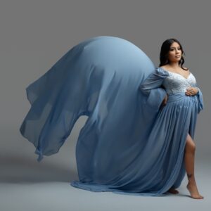 Your pregnancy photo session will become memorable and magical with the right maternity photoshoot outfit. Maternity flying dresses will bring your maternity photography aesthetic to the next level as your photographer captures your flying train in motion. Flying dress photoshoots add interest and flair to complement your gorgeous appearance and to celebrate this special time. Your maternity photoshoot dress will make you stand out with a unique look that makes for a beautiful maternity session portrait.